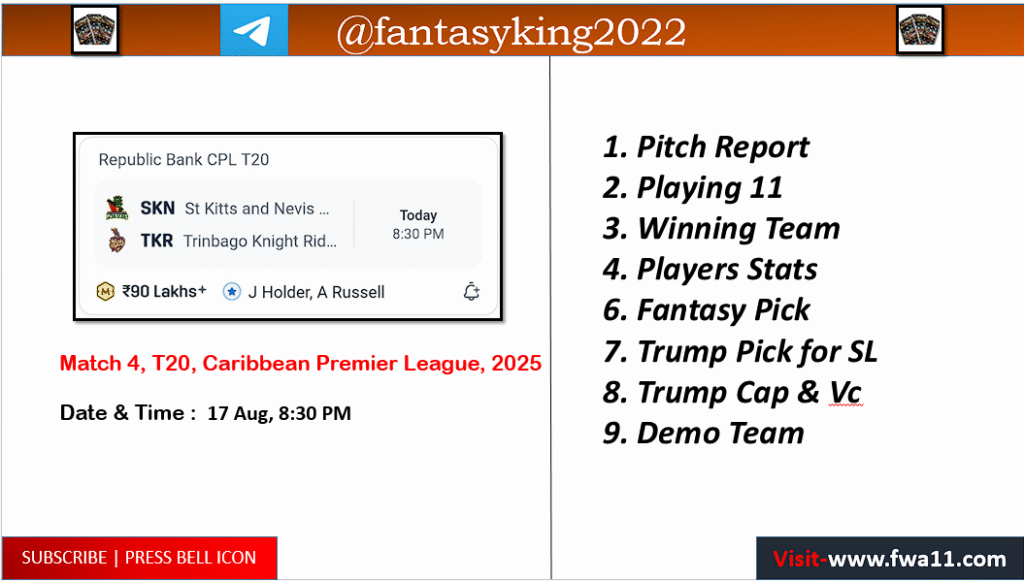SKN vs TKR Match 4 T20 Today Dream11 Prediction | Fantasy Cricket Tips, Playing 11, Live Score and Pitch Report for Caribbean Premier League, Match 4, Dream11 SKN vs TKR Match 4 T20 Today Dream11 Prediction | Fantasy Cricket Tips, Playing 11, Live Score and Pitch Report for Caribbean Premier League, Match 4, Dream11 Read More » August 17, 2025