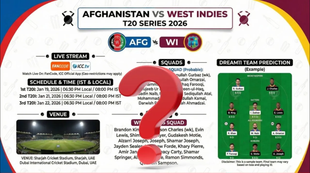 Afghanistan vs Westindies T20 2026 in UAE – Squads & Schedule | Live Streaming & Full Details | Afghanistan vs Westindies T20 2026 in UAE – Squads & Schedule | Live Streaming & Full Details | Read More » January 19, 2026