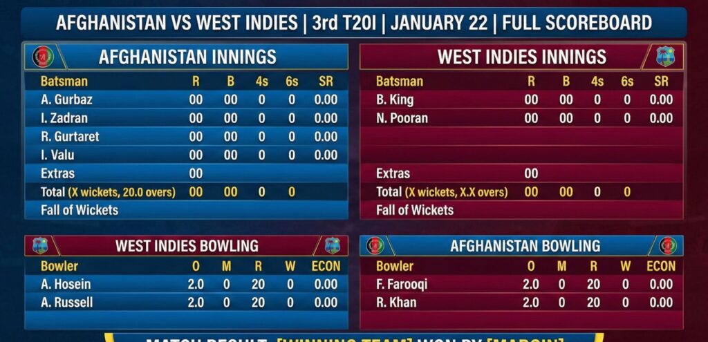 Afghanistan vs West Indies, 3rd T20I at Dubai, AFG vs WI, Jan22 2026 – Cricket Score Afghanistan vs West Indies, 3rd T20I at Dubai, AFG vs WI, Jan22 2026 – Cricket Score Read More » January 23, 2026