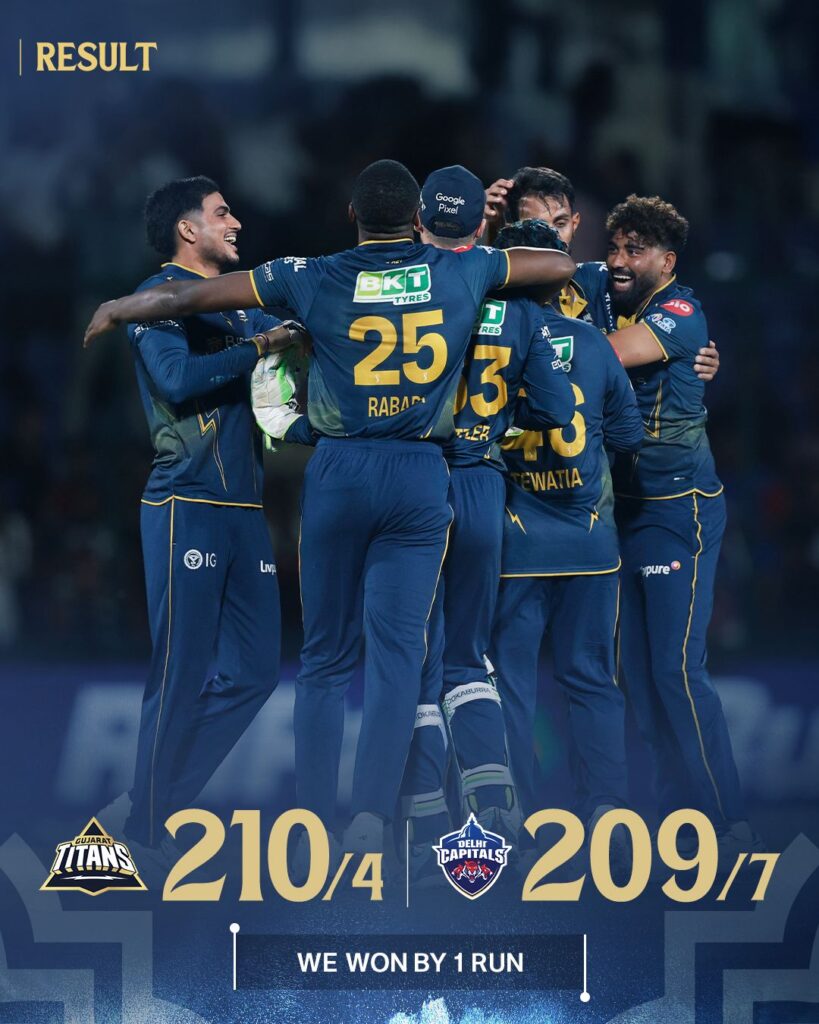 Delhi Capitals vs Gujarat Titans ,14th T20, IPL 2026 ,8th April 2026- Cricket Score Leave a Comment / SCOREBOARD Delhi Capitals vs Gujarat Titans ,14th T20, IPL 2026 ,8th April 2026- Cricket Score Table of Contents Toggle Match SummaryBEST FANTASY APP FOR IPL & PSL :-GT :-210-4(20.0)BATTINGBOWLINGDC :-209-8(20.0)BATTINGBOWLING Match SummaryToss: Delhi Capitals won the toss and elected to bowl first.Venue: Arun Jaitley Stadium, Delhi.Player of the Match: Rashid Khan (for his crucial spell of 3/17 which shifted the momentum). BEST FANTASY APP FOR IPL & PSL :-FANTASY APP NAMEAPP LINKREFFER CODE1.JUMBO APPDOWNLOADFANTASY2.VIRTUALKARTDOWNLOADCRIC3.NINJA11DOWNLOADFANTASY4.CALC11DOWNLOADFANTASYKING5.DABAFANTASYDOWNLOADFANTASYKING GT :-210-4(20.0)BATTINGBatterRB4s6sSRB Sai Sudharsanb Kumar12720171.43Shubman Gill(C)c Rana b Ngidi704545155.56Jos Buttler(WK)b Yadav522735192.59Washington Sundarc Rana b Kumar553262171.88Glenn PhillipsNOT OUT14911155.56Rahul TewatiaNOT OUT1100100.00Extras:6(b 0, lb 0, w 5, nb 1, p 0) BOWLINGBowlerOMRWERMukesh Kumar4.0055213.75Lungi Ngidi4.002416.00Axar Patel(C)3.0032010.67Kuldeep Yadav4.0042110.50T Natarajan4.003408.50Vipraj Nigam1.0023023.00 DC :-209-8(20.0)BATTINGBatterRB4s6sSRPathum Nissankac Tewatia b Krishna412461170.83KL Rahul(WK)c Buttler b Siraj9252114176.92Nitish Ranac Sudharsan b Khan561083.33Sameer RizviIMPACTb Khan01000.00David MillerNOT OUT412033205.00Axar Patel(C)c Phillips b Khan230066.67Tristan Stubbsrun out Sudharsan7600116.67Vipraj Nigamc Gill b Krishna12720171.43Kuldeep Yadavrun out Buttler1100100.00Extras:8(b 0, lb 0, w 8, nb 0, p 0) BOWLINGBowlerOMRWERMohammed Siraj4.0052113.00Kagiso Rabada4.003208.00Rashid Khan4.001734.25Ashok Sharma3.0045015.00Prasidh KrishnaIMPACT4.0052213.00Washington Sundar1.0011011.00 For Final Team Joined My Telegram Channel Post Views: 6