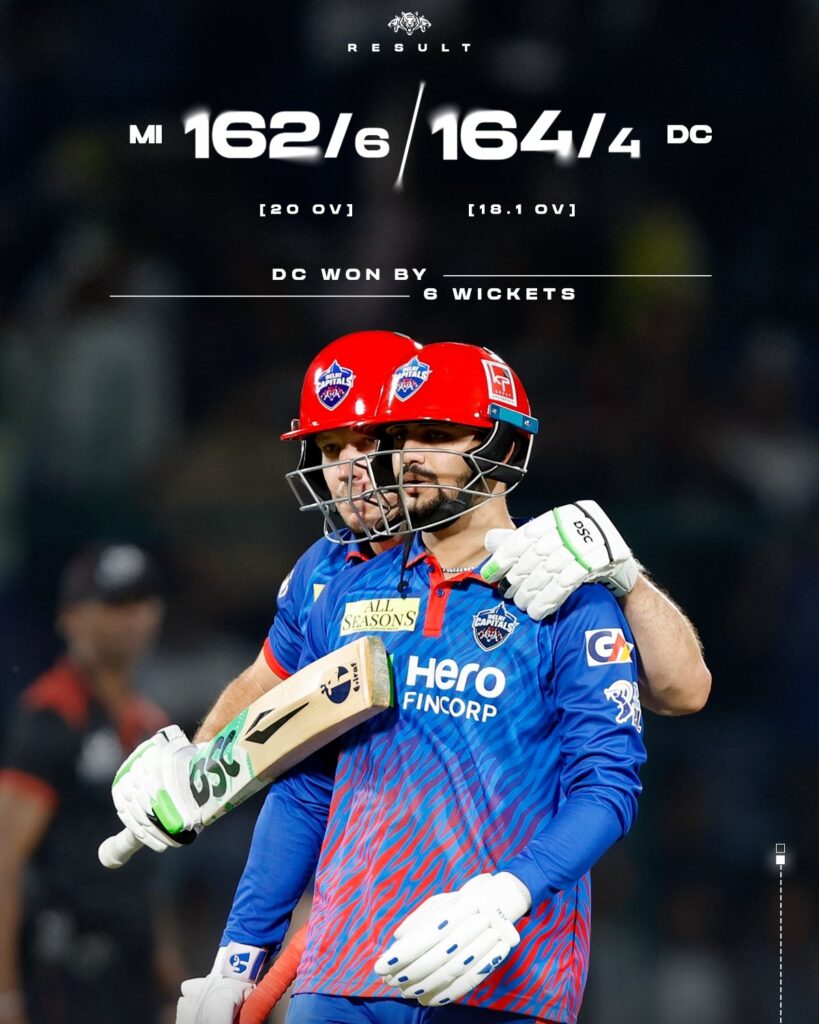 Delhi Capitals vs Mumbai Indians , 8th T20, IPL 2026 ,3rd April 2026- Cricket Score Leave a Comment / SCOREBOARD Delhi Capitals vs Mumbai Indians , 8th T20, IPL 2026 ,3rd April 2026- Cricket Score Table of Contents Toggle Match SummaryBEST FANTASY APP FOR IPL & PSL :-First Innings: Mumbai Indians (162/6 in 20 Overs) Second Innings: Delhi Capitals (164/4 in 18.1 Overs) Match SummaryToss: Delhi Capitals won the toss and elected to bowl first.Venue: Arun Jaitley Stadium, Delhi.Result: Delhi Capitals won by 6 wickets.Player of the Match: Sameer Rizvi (90 off 51 balls). BEST FANTASY APP FOR IPL & PSL :-FANTASY APP NAMEAPP LINKREFFER CODE1.JUMBO APPDOWNLOADFANTASY2.VIRTUALKARTDOWNLOADCRIC3.NINJA11DOWNLOADFANTASY4.CALC11DOWNLOADFANTASYKING5.DABAFANTASYDOWNLOADFANTASYKING First Innings: Mumbai Indians (162/6 in 20 Overs) BatterRB4s6sSRRyan Rickelton(WK)c Patel b Kumar9112081.82Rohit Sharmac Rana b Patel352651134.62Tilak Varmac&b Kumar02000.00Suryakumar Yadav(C)lbw b Ngidi513632141.67Sherfane Rutherfordc Kumar b Nigam571071.43Naman Dhirc Stubbs b Natarajan282121133.33Mitchell SantnerNOT OUT181320138.46Corbin BoschNOT OUT11420275.00Extras:5(b 0, lb 1, w 4, nb 0, p 0) BowlerOMRWERMukesh Kumar3.002628.67Lungi Ngidi4.003418.50Axar Patel(C)4.002215.50Vipraj Nigam3.002418.00Kuldeep Yadav3.0031010.33T Natarajan3.002418.00 Second Innings: Delhi Capitals (164/4 in 18.1 Overs)BatterRB4s6sSRKL Rahul(WK)c Rickelton b Chahar130033.33Pathum Nissankac Markande b Santner443061146.67Nitish Ranarun out Bumrah03000.00Sameer RizviIMPACTc Varma b Bosch905177176.47David MillerNOT OUT211840116.67Tristan StubbsNOT OUT340075.00Extras:5(b 0, lb 1, w 4, nb 0, p 0) BowlerOMRWERDeepak Chahar3.002016.67Jasprit Bumrah4.002105.25Mitchell Santner3.002217.33Shardul Thakur3.0041013.67Mayank MarkandeIMPACT2.0020010.00Corbin Bosch3.1039112.32 For Final Team Joined My Telegram Channel Post Views: 5