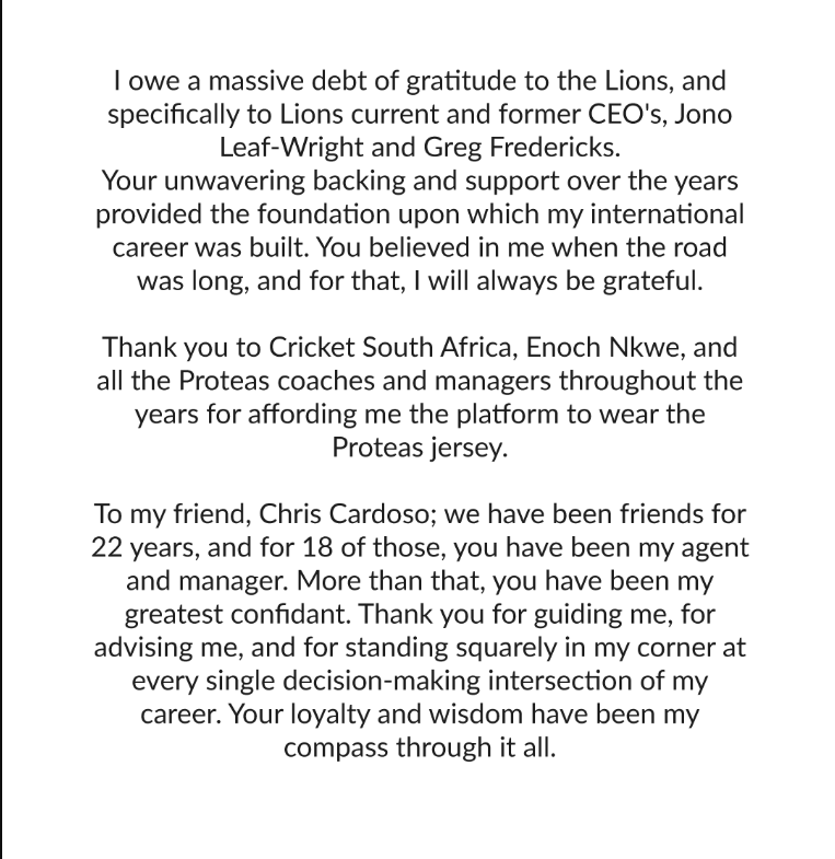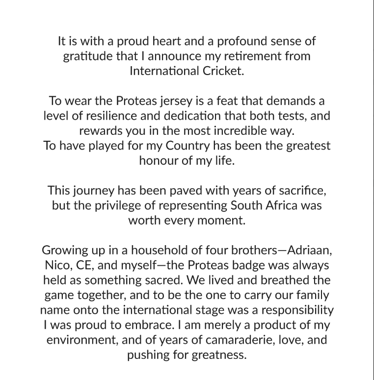 “It is with a proud heart and a profound sense of gratitude that I announce my retirement from international cricket. To wear the Proteas jersey is a feat that demands a level of resilience and dedication that both tests, and rewards you in the most incredible way. To have played for my country has been the greatest honour of my life.”